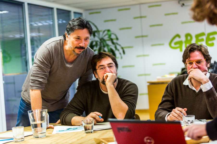 Carlos Bardem, Javier Bardem y Álvaro Longoria en las oficinas de Greenpeace España. Foto: Greenpeace/Juan Lafita