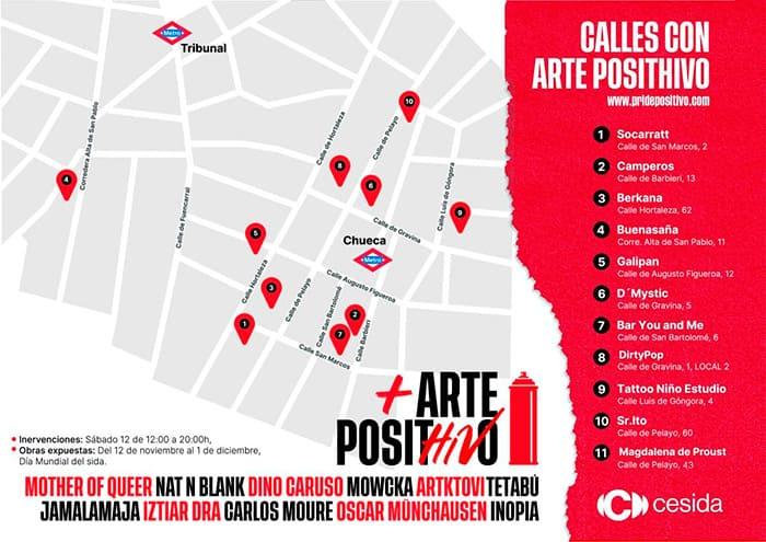Los artistas que participarán en Arte Positivo serán: Mother of Queer, Nat N Blank, Inopia, Tetabú, Jamalamaja, Artktovi, Carlos Moure, Iztiar Dra, Oscar Münchausen, Dino Caruso y Mowcka. Sus pinturas se podrán visitar desde el 12 de noviembre hasta el 1 de diciembre, cuando se celebra el Día Mundial del Sida.