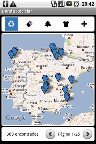 Basada en Google Maps, DondeReciclar ofrece la opción de buscar cinco tipos de puntos de reciclaje para depositar aquellos objetos que consideres que puedan ser reutilizados/reciclados: