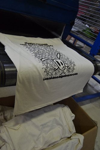 El tintado de las camisetas es uno de los procesos más contaminantes. Rafa nos explica que ahora se está comenzando a exigir por ley tintas menos contaminantes. Los plastisoles, que son las tintas que más se utilizan, ya vienen libres de metales pesados, aún así, tienen PVC, que es contaminante. Hay tintas libres de PVC pero son bastantes caras y la calidad y durabilidad no es muy buena. Espera que con el tiempo la calidad de estas tintas vayan mejorando. Luego están las tintas al agua, que contaminan menos porque ya no tienen una base plástica. Esta es la tinta que se ha empleado en las camisetas de Cuentamealgobueno.