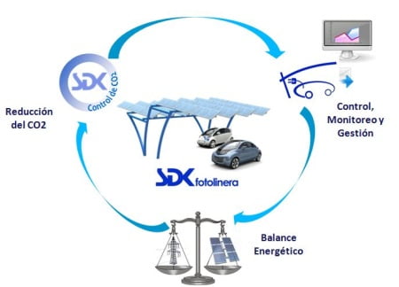 La instalación de la fotolinera la ha realizado la joven e innovadora empresa española SDK Sendekia, con sedes en Madrid, Portugal, Estados Unidos y Venezuela. Para esta empresa, el futuro del ahorro energético está en acercar la producción a las zonas de consumo, concepto que se conoce como generación distribuida. Las energías que favorecen este acercamiento son la energía solar fotovoltaica y la mini-eólica, ambas con posibilidades de ser combinadas con otras energías constituyendo soluciones híbridas.