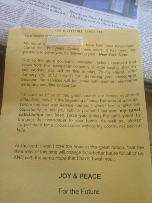 Hace unos días leía en Twitter el retweet que hacía una persona a la que sigo de un tweet de Katie Jacobs Stanton, que decía: «Sad day for my @nytimes delivery man. Laid off as they find a cheaper delivery service. His classy farewell letter.» lo que viene a significar «Día triste para mi repartidor de periódicos del NY Times. Despedido porque buscan un servicio de envío más barato. Su elegante carta de despedida» y colgaba esta foto de la carta de despedida que dejó su repartidor junto con el último periódico que le repartió: