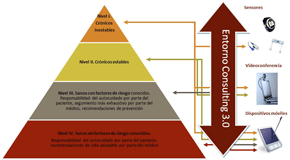 El primer paso por parte de los expertos ha sido diseñar una ‘pirámide de estratificación’ para pacientes que permite categorizar su nivel de salud en sanos o enfermos y participar, con ello, de la prevención y el seguimiento de las patologías. Asimismo, y en función de la gravedad que presenten, las herramientas de seguimiento del médico pueden ser de una manera o de otra. En esta pirámide desarrollada por el equipo de investigación, en el nivel uno y dos, se encuentran las personas sanas sin factores de riesgo, o enfermos con factores conocidos durante cortos periodos de tiempo. En ambos el control es sencillo y se realiza a través de dispositivos móviles como Smartphone, ordenadores portátiles o Tablet de forma más o menos intensa, en función de si existe o no un riesgo identificado. En los niveles tres y cuatro, están los pacientes crónicos estables e inestables. En estos casos, la comunicación es más estrecha y se utiliza otro tipo de herramientas como las videoconferencias o técnicas más invasivas como los biosensores.