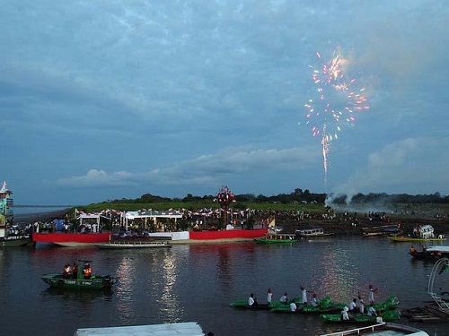 Un narrador relataba los mitos desde la embarcación oficial mientras desfilaban los pequeños barcos y balsas con coloridas representaciones de la luna, los arboles y de animales de la zona como el delfín rosado, la anaconda, la garza y el caimán.