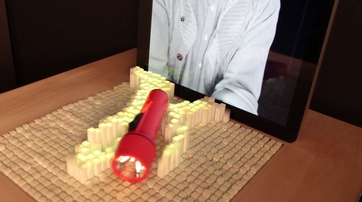 Como se puede ver en el vídeo, el dispositivo puede interaccionar con el mundo físico que hay alrededor suya, por ejemplo moviendo objetos en la superficie de la mesa.