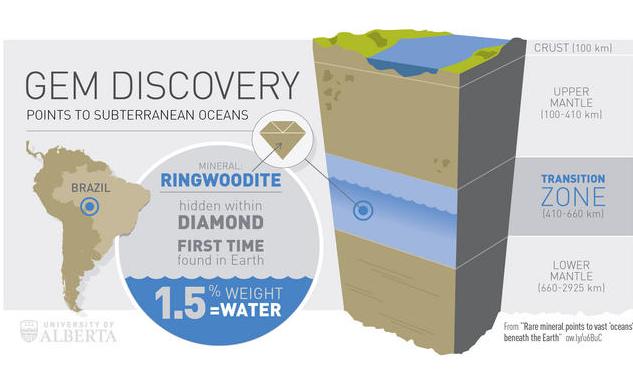 Un equipo de investigadores, liderado por la Universidad de Alberta, ha encontrado un diamante rico en agua procedente del manto terrestre. Esta pieza contiene un mineral denominado ringwoodita, que hasta ahora solo se había identificado en un meteorito. Según un estudio que publica la revista Nature, la presencia de este mineral prueba la existencia de grandes volúmenes de agua en las profundidades de la Tierra.