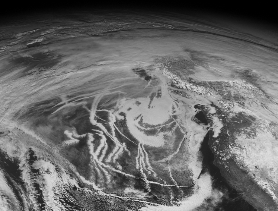 Estelas de barcos. Esas líneas serpenteantes que se ven junto a la costa occidental de EEUU (a la derecha) son las estelas que los barcos mercantes dejan en su camino por el Pacífico.