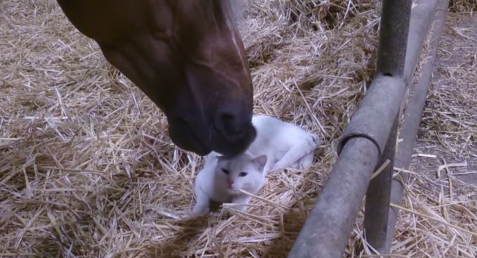 El gato por su parte está tan a gusto que acaba tumbándose disfrutando de los mimos del caballo…