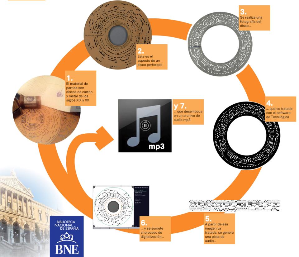 El proyecto, desarrollado por Tecnilógica en colaboración con la BNE, se inició a principios de 2012 dentro del área de ‘Proyectos Marcianos’ de la empresa y ha convertido en archivos digitales de audio una valiosa colección de piezas musicales grabadas en discos perforados de cartón y metal fabricados durante la segunda mitad del siglo XIX. Gracias a él, actualmente las piezas pueden ser escuchadas online a través de la Biblioteca Digital Hispánica, la plataforma de la BNE para la difusión pública de su patrimonio a través de Internet.