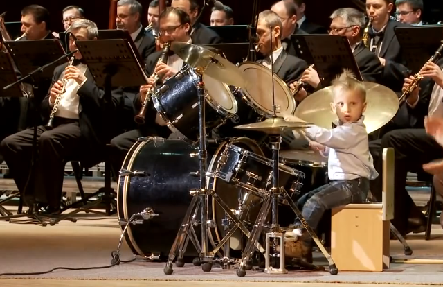 Un niño de tres años toca la batería en una orquesta sinfónica rusa.