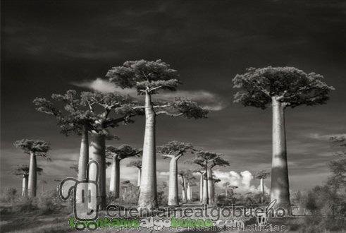 Los árboles que se muestran en él, incluyen algunos que tienen más de mil años, incluyendo los fantásticos árboles ‘Dracaena cinnabari‘ o árboles de sangre de dragón, con su característica forma de paraguas y que sólo se encuentran en la isla de Socotra, en el Cuerno de África.