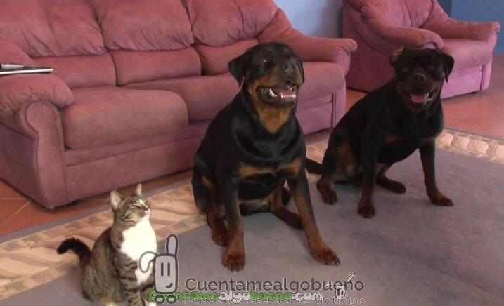 Cuando le piden que se eche, la gata, Lucy y Phoenix, dos perros rottweilers, obedecen. Luego el compañero humano de estos simpáticos animales les pide que giren y lo hacen de forma ordenada, uno por uno, incluso la felina.
