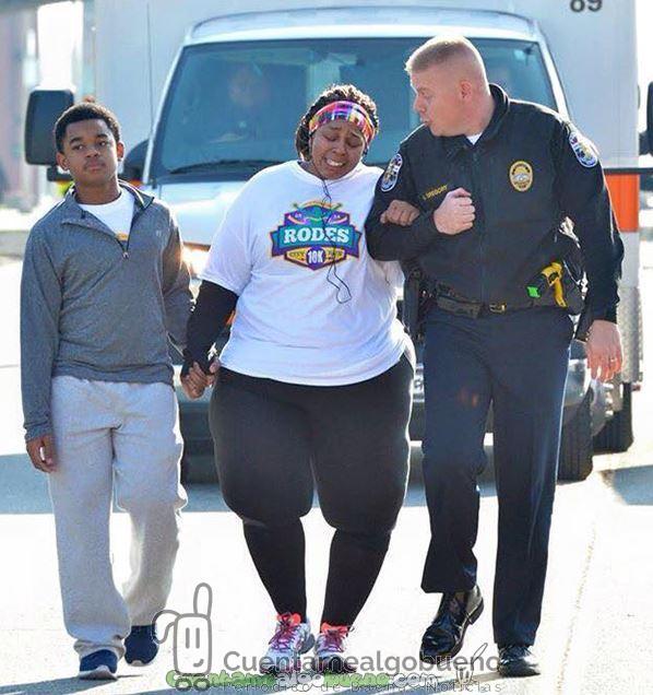 Un oficial de policía de Louisville que se percató de la situación de la mujer, comenzó a dedicarle palabras de aliento y le ofreció su brazo para que pudiera apoyarse en él. Las fotos que tomaron de las escena lo dicen todo…