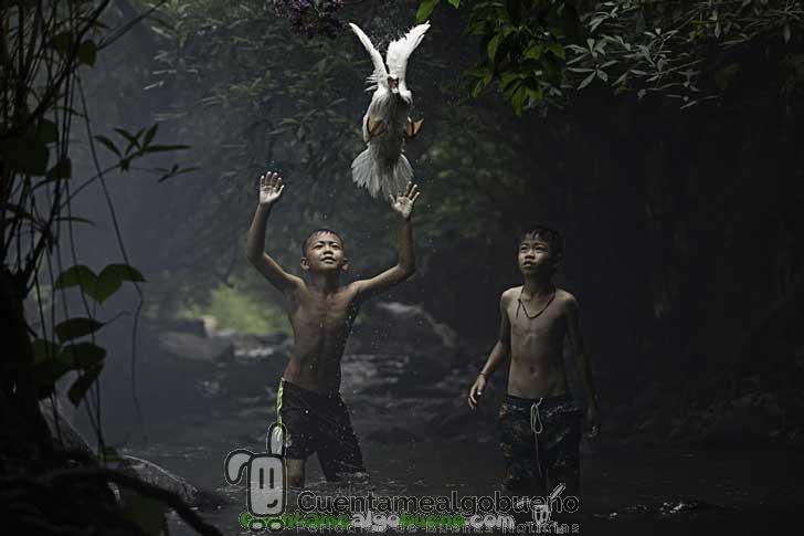 “La captura de un pato”. Dos muchachos están tratando de atrapar a un pato en el arroyo de la cascada, en Nong Khai, Tailandia.