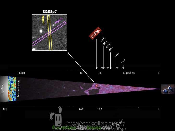 Los investigadores han explicado que, al comienzo, los átomos de hidrógeno habrían sido absorbidos por la luz emitida de las primeras galaxias. Esta emisión UV se calienta y produce una línea conocida como línea Lyman – alfa (nube de hidrógeno con una enorme concentración de gas), esto significa que la hace más luminosa. Antes de la «EGS8p7», la galaxia más lejana tenía un corrimiento al rojo de 7,73, pero tras este nuevo descubrimiento lograron detectar que esta tiene un corrimiento al rojo de 8,68.