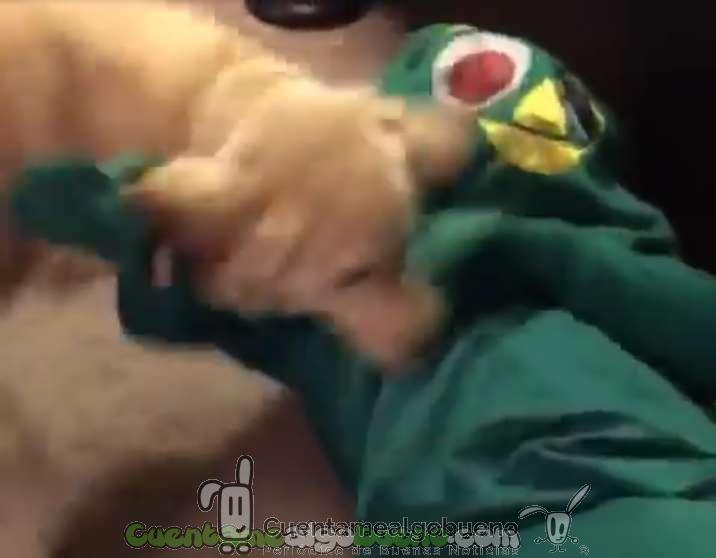20161111-3-perro-emocionado-ver-gumby-tamano-humano-01Es lo que Ben Mesches decidió comprobar con Jolen, la perra de raza Golden Retriever de su novia, cuando decidió acudir a su casa disfrazado de su muñeco favorito, un peluche verde.