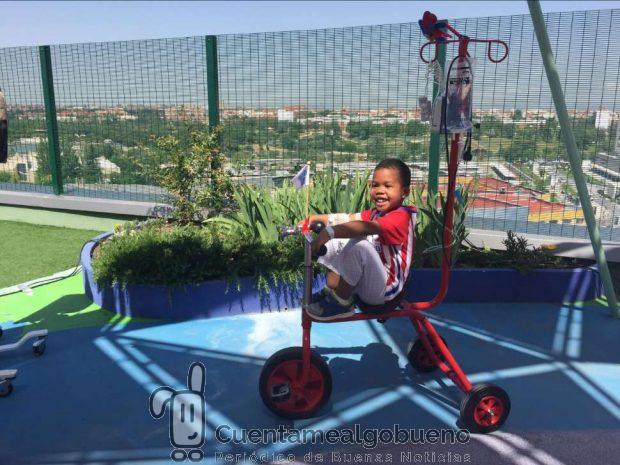 Un triciclo portasueros para que los niños en tratamiento de quimioterapia del 12 de Octubre puedan «corretear».