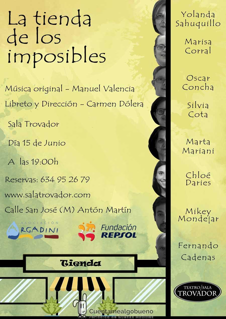El grupo de teatro “La palabra en escena” de la Asociación Argadini, entidad sin ánimo de lucro que trabaja para mejorar la inclusión social y cultural de personas con discapacidad y TEA, estrena hoy jueves 15 de junio a las 19:00 horas, en la Sala Trovador, su obra “La Tienda de los Imposibles”.