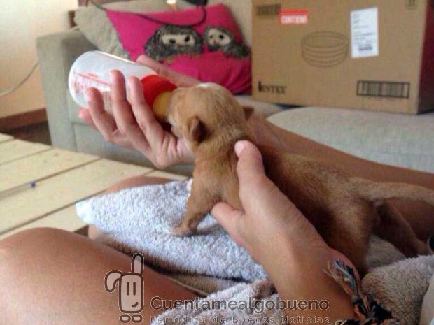 Álvaro nos explica que estos cachorros, «al ser lactantes, necesitan muchos cuidados las 24 h. del día: darle el biberón, enseñarles a hacer pipí y caca con un pañito húmedo —imitando la lengua de su madre—.