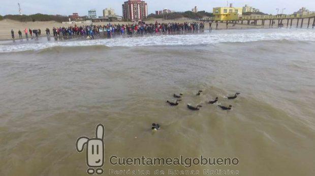 Voluntarios de la Fundación Mundo Marino, de San Clemente del Tuyú (Argentina) acompañados por una multitud, han reincorporado recientemente al mar a nueve pingüinos magallánicos que habían sido socorridos por su Centro de Rescate y Rehabilitación.
