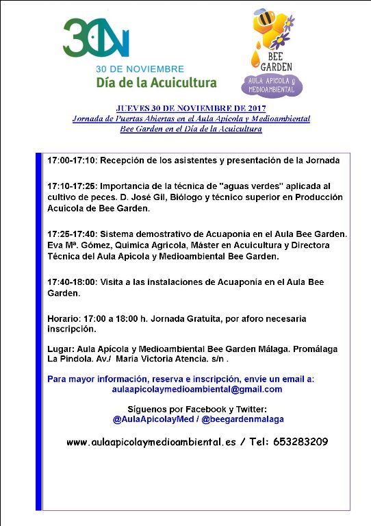 Tras varios años divulgando el papel medioambiental de las abejas y la importancia de la protección medioambiental a través de talleres medioambientales y cursos de Apicultura, Bee Garden continúa su labor de divulgación en otros campos medioambientales, en esta ocasión con motivo del Día de la Acuicultura celebra una Jornada de Puertas Abiertas en el Aula Apícola y Medioambiental Bee Garden en Promálaga La Pindola.
