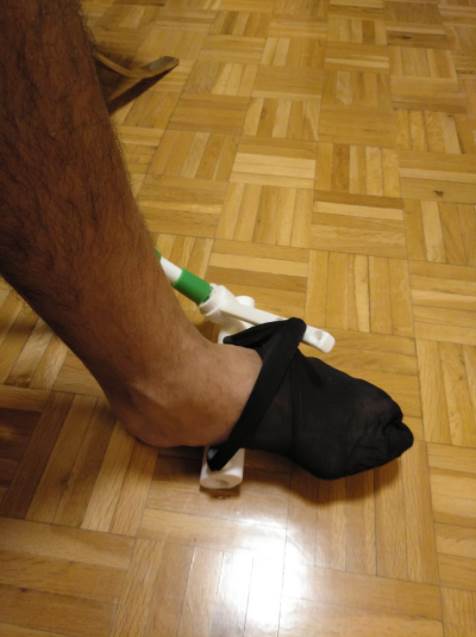 Una vez fijados estos topes, se coloca la prenda sin fijar definitivamente sobre estas piezas para garantizar la inclinación del pie. El siguiente paso es introducir la extremidad ligeramente hacia el calcetín con la ayuda del mango telescópico.