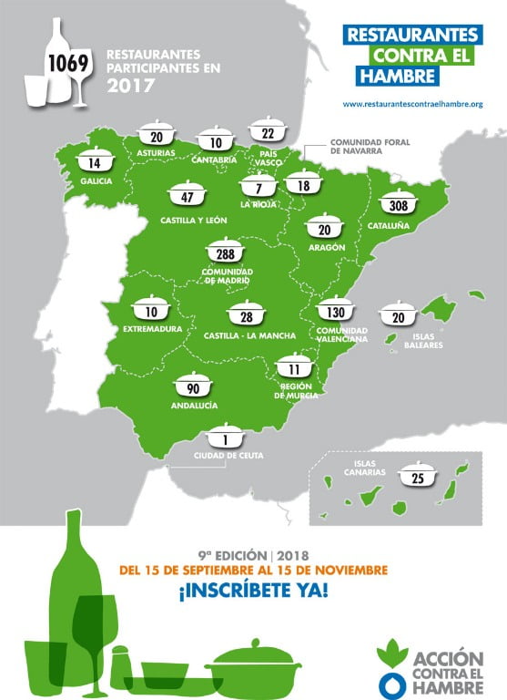 Restaurantes contra el Hambre, organizado con el apoyo de la Federación Española de Hostelería (FEHR), celebrará su 9ª edición del 15 de septiembre al 15 de noviembre. Durante ese tiempo, los establecimientos pondrán en su carta un plato, varios platos o un menú solidarios.