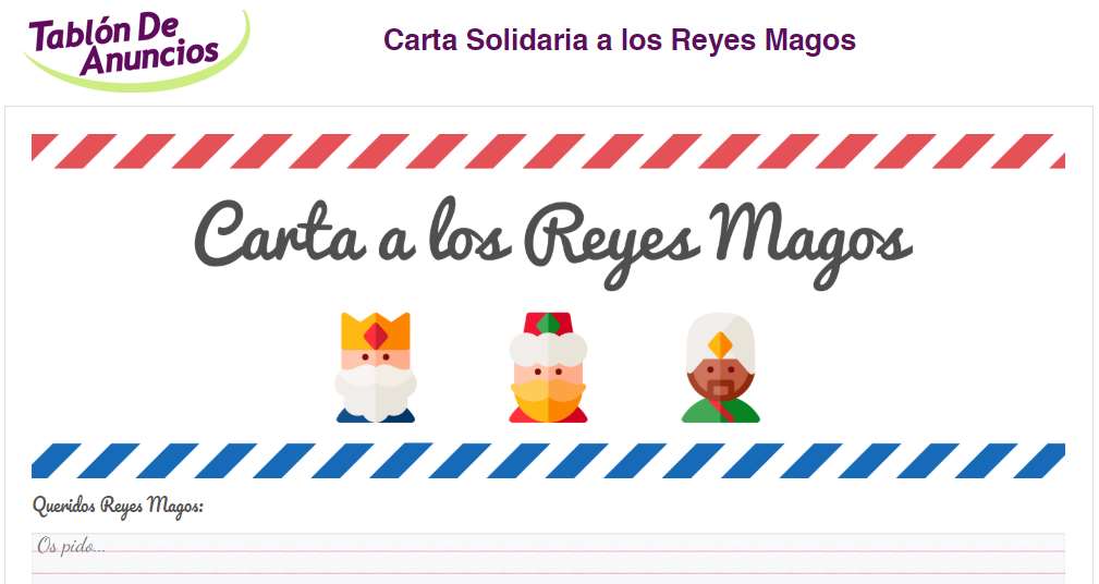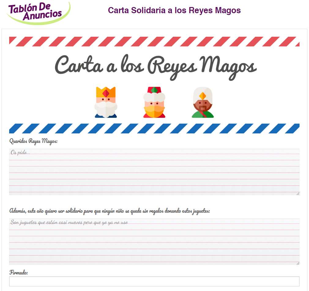Si quieres que tus hijos o hijas escriban ya su Carta a los Reyes Magos Solidaria visita la web de tablondeanuncios.com.